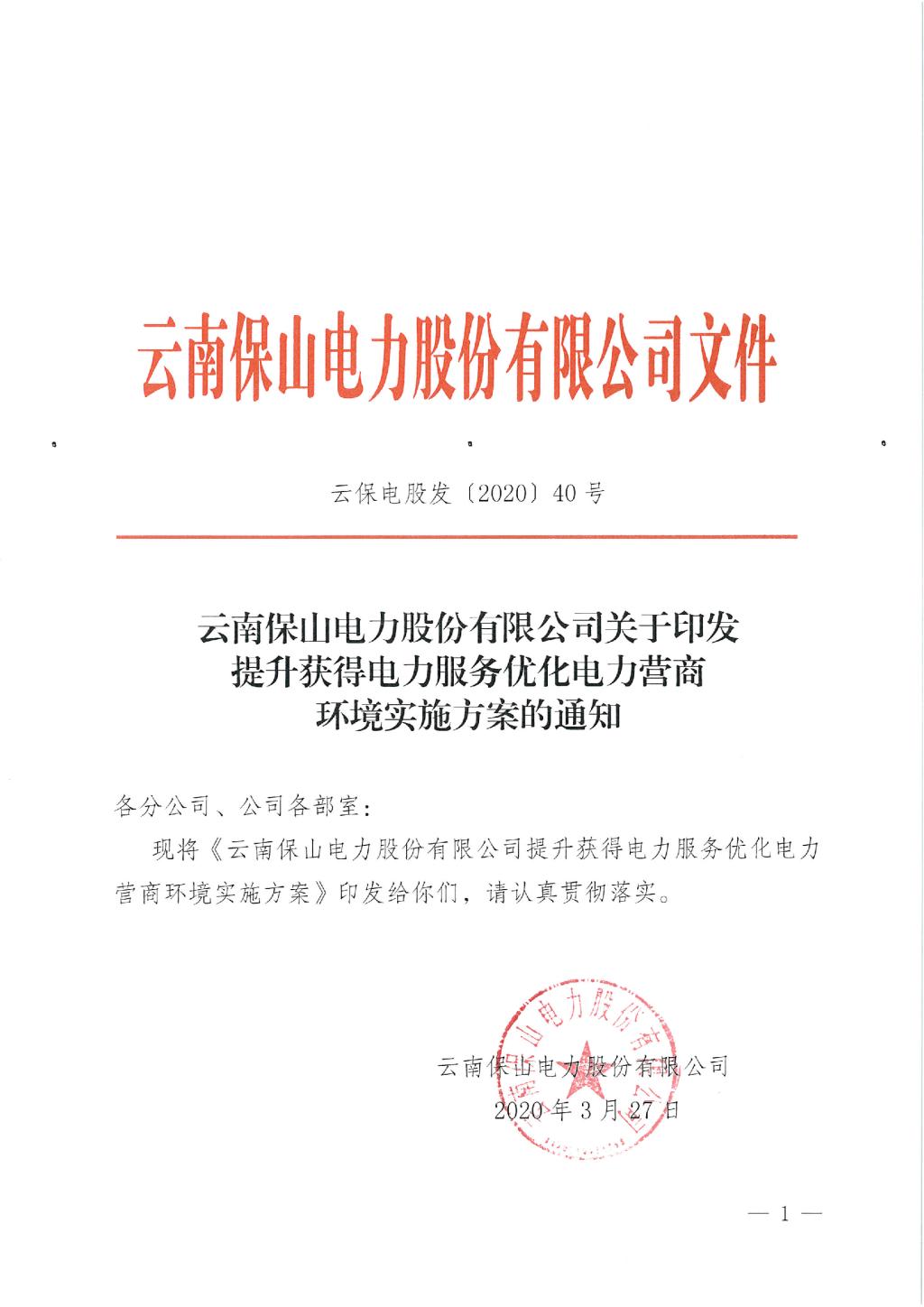 云南保山电力股份有限公司关于印发提升获得电力服务优化电力营商环境实施方案的通知